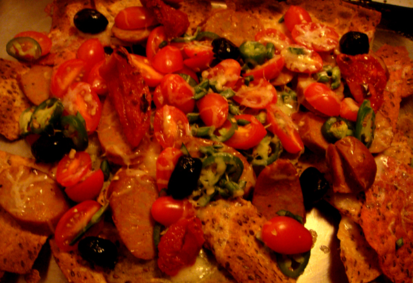 Lazy evenings at Cafe D. dictate quick-cooking and easy to assemble meals, hence a recent dinner of nachos as seen above. Clean Sweeping the fridge, we topped Trader Joe's Flax Seed Chips with sliced chicken sausage, oil-cured olives, grape and sun-dried tomatoes, sliced jalapenos, leftover salsa and cheddar and provolone cheeses.